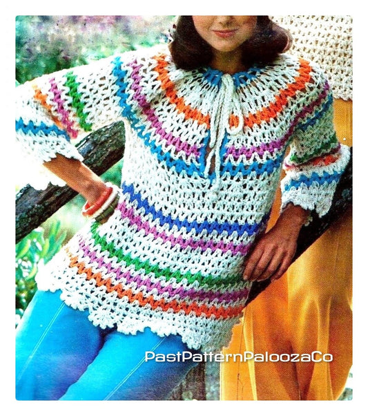 Vintage Crochet Pattern Womens Rainbow Stripe Smock Top PDF Instant Digital Download Lacy Retro Blouse Drawstring Neck 10 Ply