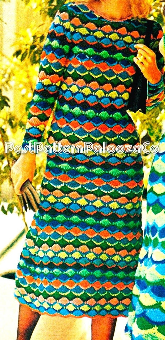 Vintage Crochet Pattern Womens Mosaic Midi Dress PDF Instant Digital Download Retro Rainbow Shells Cocktail Gown '70s Glam Maxi Midi or Mini