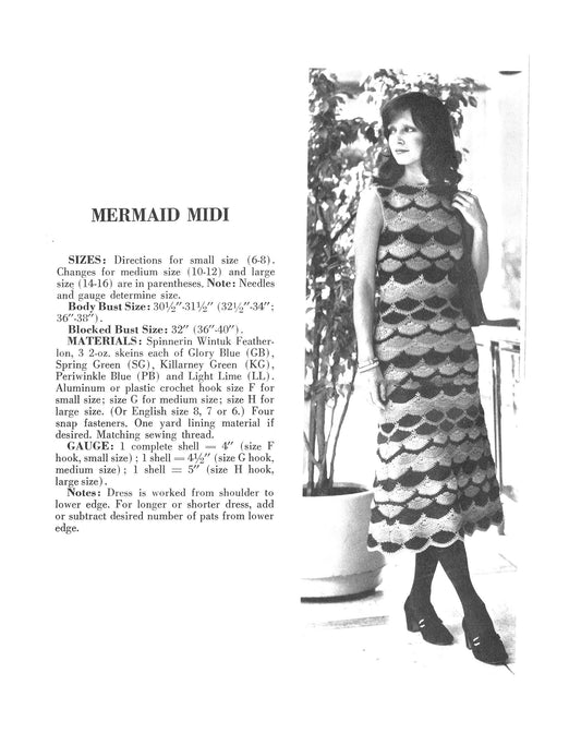 Vintage Crochet Pattern Womens Mermaid Midi Tank Dress PDF Instant Digital Download Retro Stunning Shells Scales Gown '70s Maxi Midi or Mini