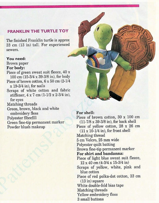 Vintage Sewing Pattern 13" Franklin the Turtle Doll PDF Instant Digital Download Plush Fabric Soft Toy
