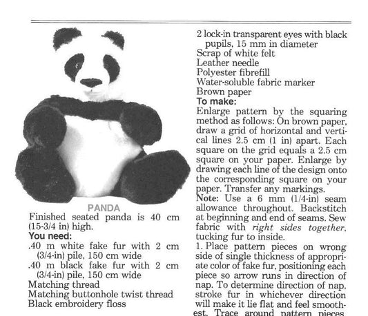 Vintage Sewing Pattern 16" Plush Panda Bear Toy PDF Instant Digital Download Sewn Soft Faux Fur Fabric Teddy Bear