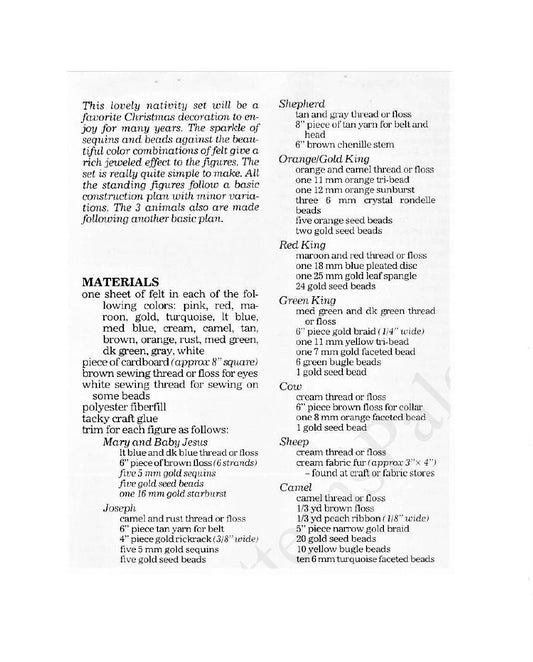 Vintage Christmas Sewing Pattern Felt Nativity Set 9 Figures Animals PDF Instant Digital Download Plush Stuffed Bead Sequin Embellished