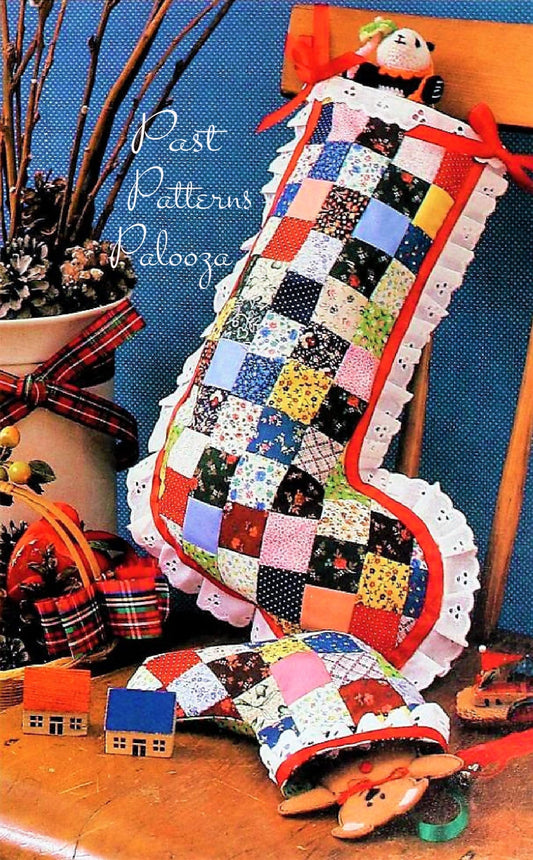 Vintage Christmas Sewing Pattern Pretty Patchwork Squares Memory Stocking and Ornament 2 Sizes PDF Instant Digital Download Eyelet Ruffle