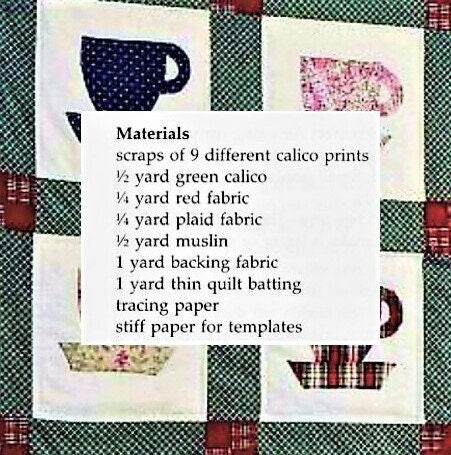 Vintage Sewing Pattern Calico Teacups Quilt Wall Hanging PDF Instant Digital Download Applique Tea Cups 34 x 34