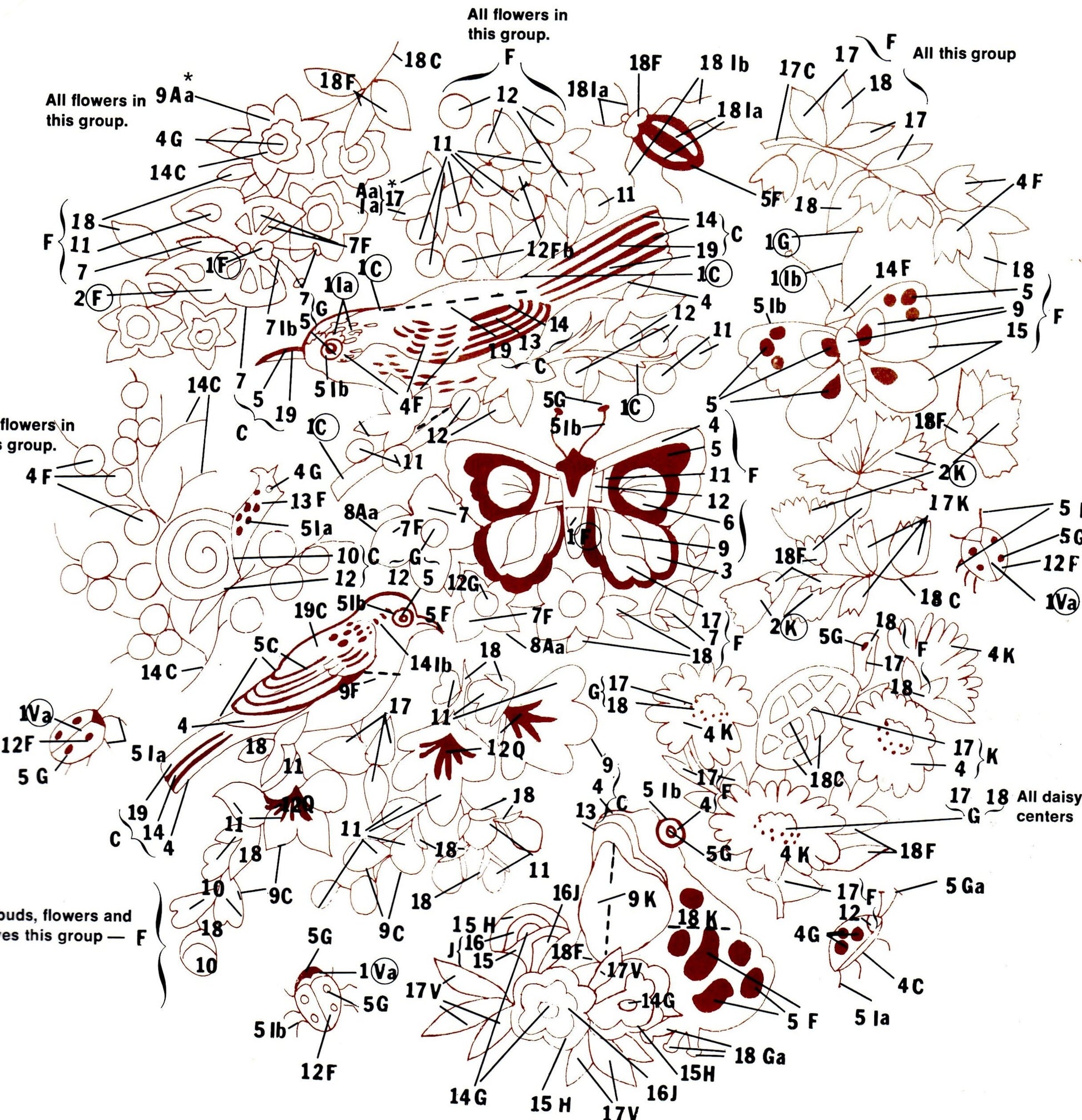 Digital file includes: color photo, traceable pattern, crewel embroidery stitch chart(s) and instructions and color key diagram.