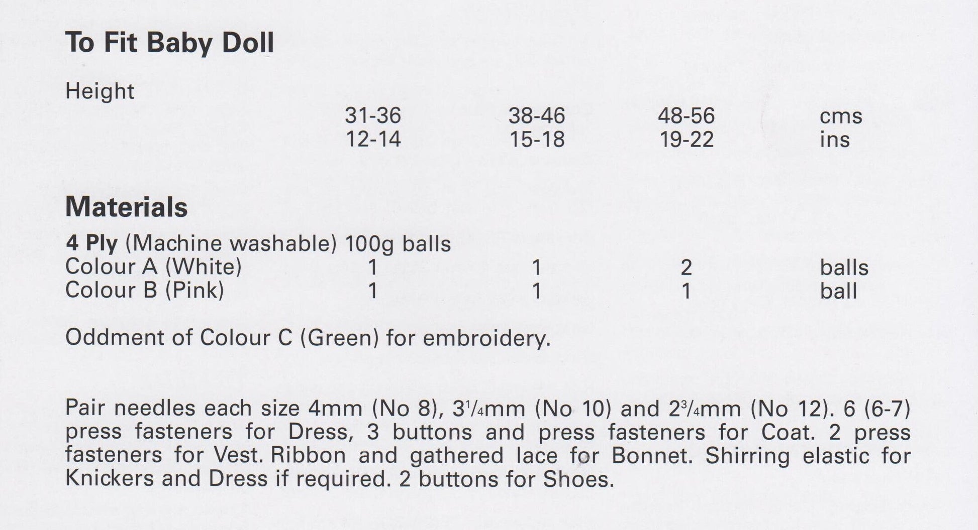 Offering a vintage PDF knitting pattern to make an adorable classic clothes layette for three doll sizes : 12-14, 15-18 and 19-22 inches (31-36, 38-46, 48-56cm)