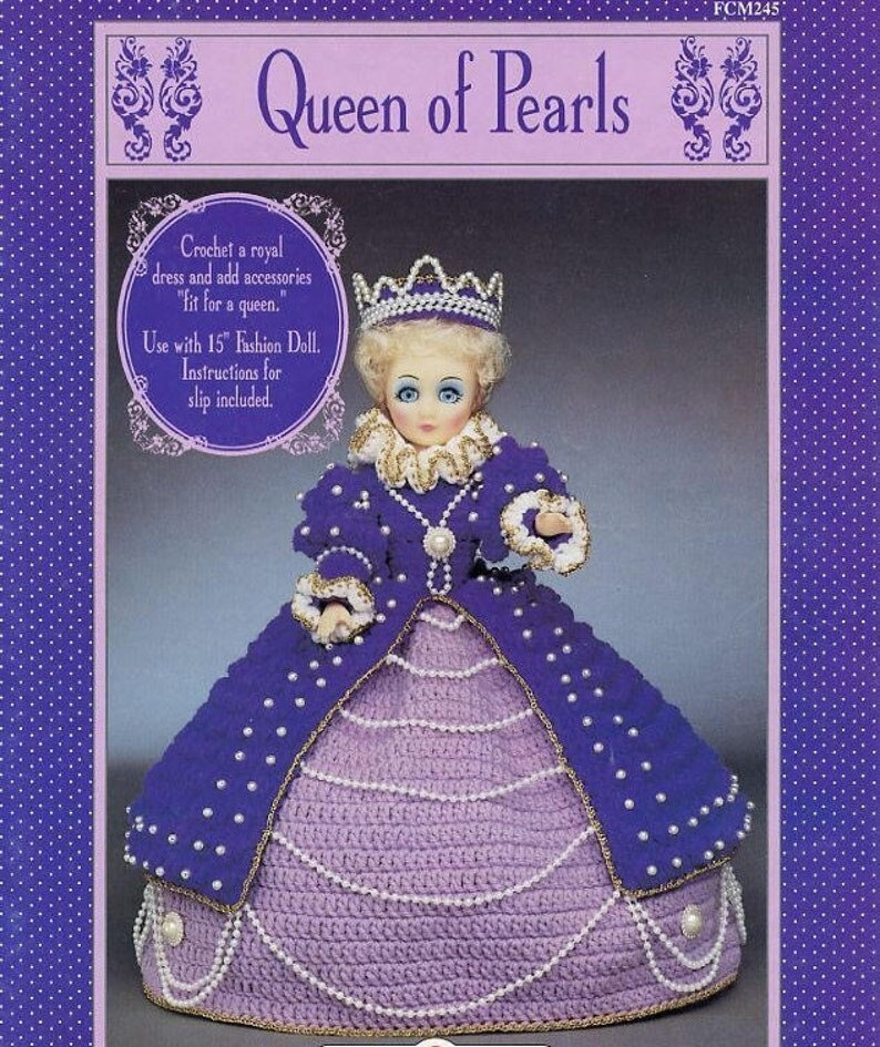 Offering a vintage instant PDF pattern for crochet to make a "Queen of Pearls" bed doll outfit!