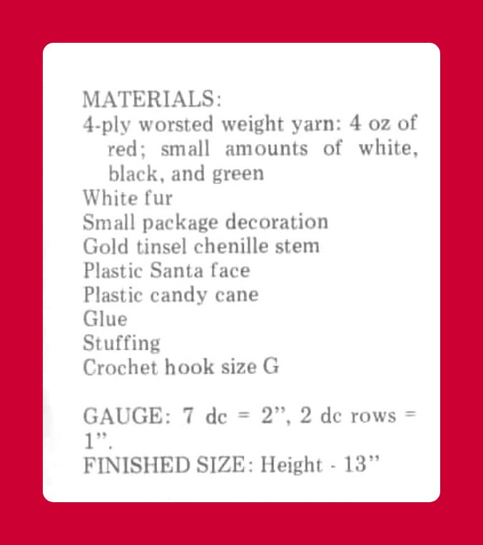 Requires four plied worsted weight yarn, scrap of white faux fur fabric, plastic craft Santa face, mini craft present and candy cane embellishments, gold chenille stem/pipe cleaner, glue, stuffing and US hook size G.