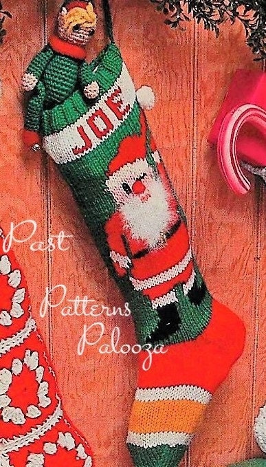 Vintage Christmas Knitting Pattern Tree and Winking Santa Name Stocking Crochet Granny Square Stocking Retro PDF Instant Digital Download