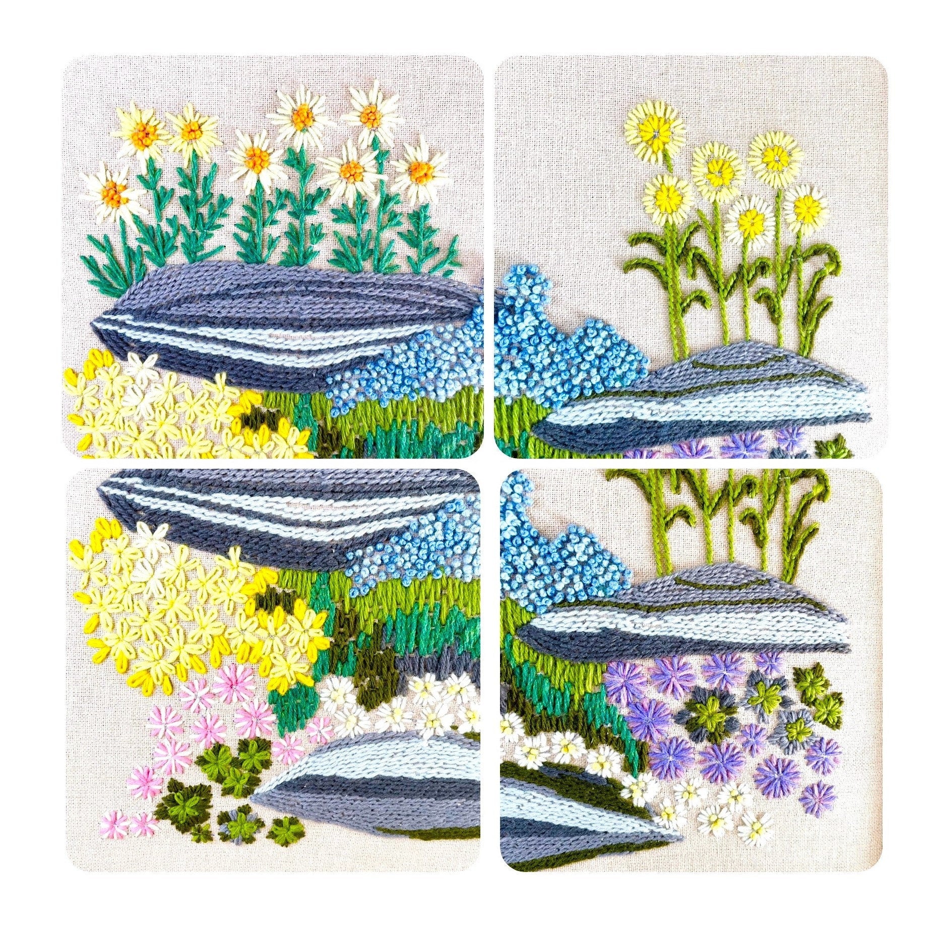 Offering a vintage digital PDF pattern to make a pretty, crewel embroidered "Rock Garden" with gorgeous stitched flowers, rocks and greenery :).