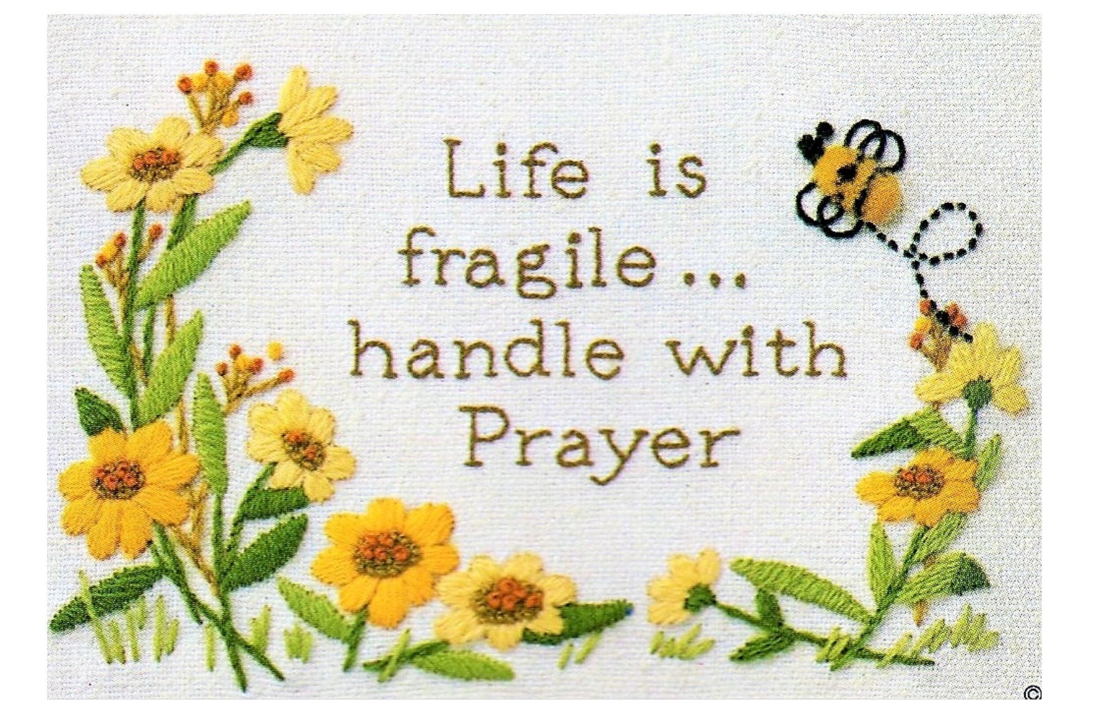 Vintage Crewel Embroidery Pattern Life Is Fragile Handle With Prayer Bumblebee Yellow Flowers Design PDF Instant Download Mini Stitchery 5x7