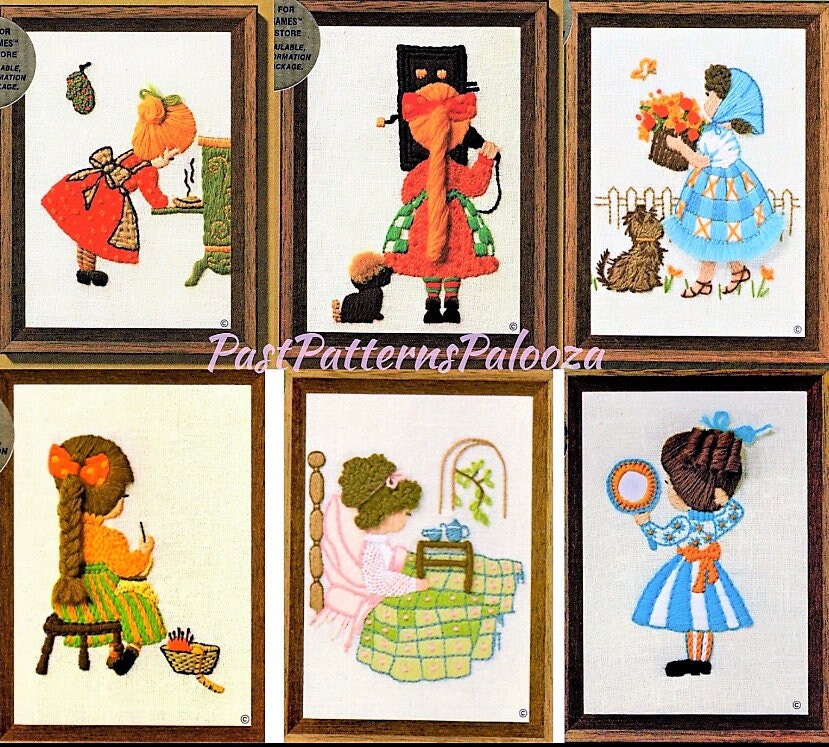 Vintage Crewel Embroidery Patterns Cute Kitsch Girls Old Fashioned Little Ladies PDF Instant Download Mini Stitchery 5x7 Lot of Six Designs