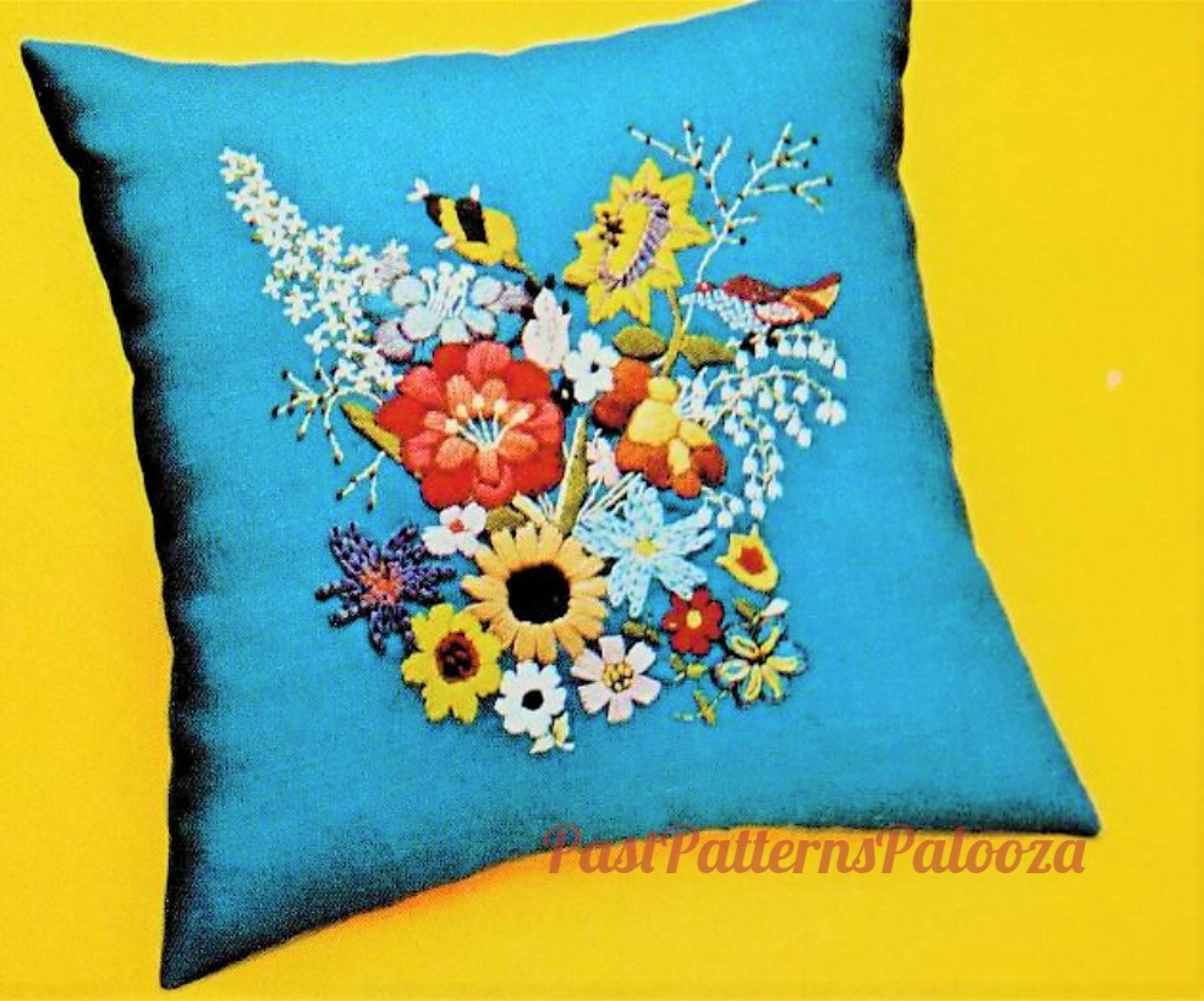 Vintage Crewel Embroidery Sewing Pattern 17" Sunshine Garden Pillow PDF Instant Digital Download Retro Floral Flower Little Bird Cushion