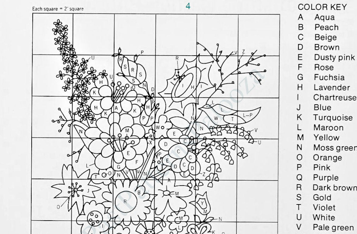 Easy step by step written instructions for stitching design and pillow assembly is offered. Embroidery stitch guide and design template chart with color keys is also provided. Gridded design will need to be enlarged to transfer to pillow ( 1 square = 2 inches).