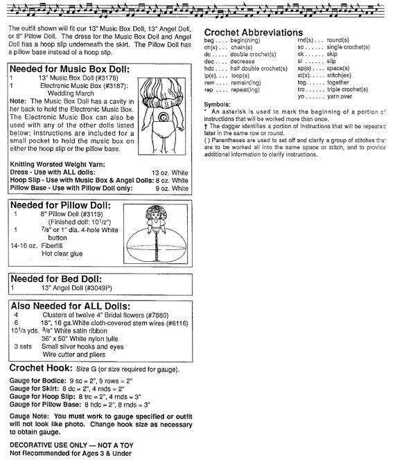 Offers complete instructions to make billowing crocheted Bridal outfit for 13" Music Box dolls, 8" Pillow Dolls or 13" standing Bed Dolls.
