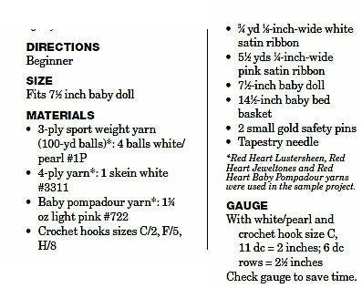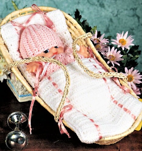 Offering a vintage PDF crochet pattern to make a sweet sleepy time outfit and bunting set for a 7 to 8 inch baby doll.