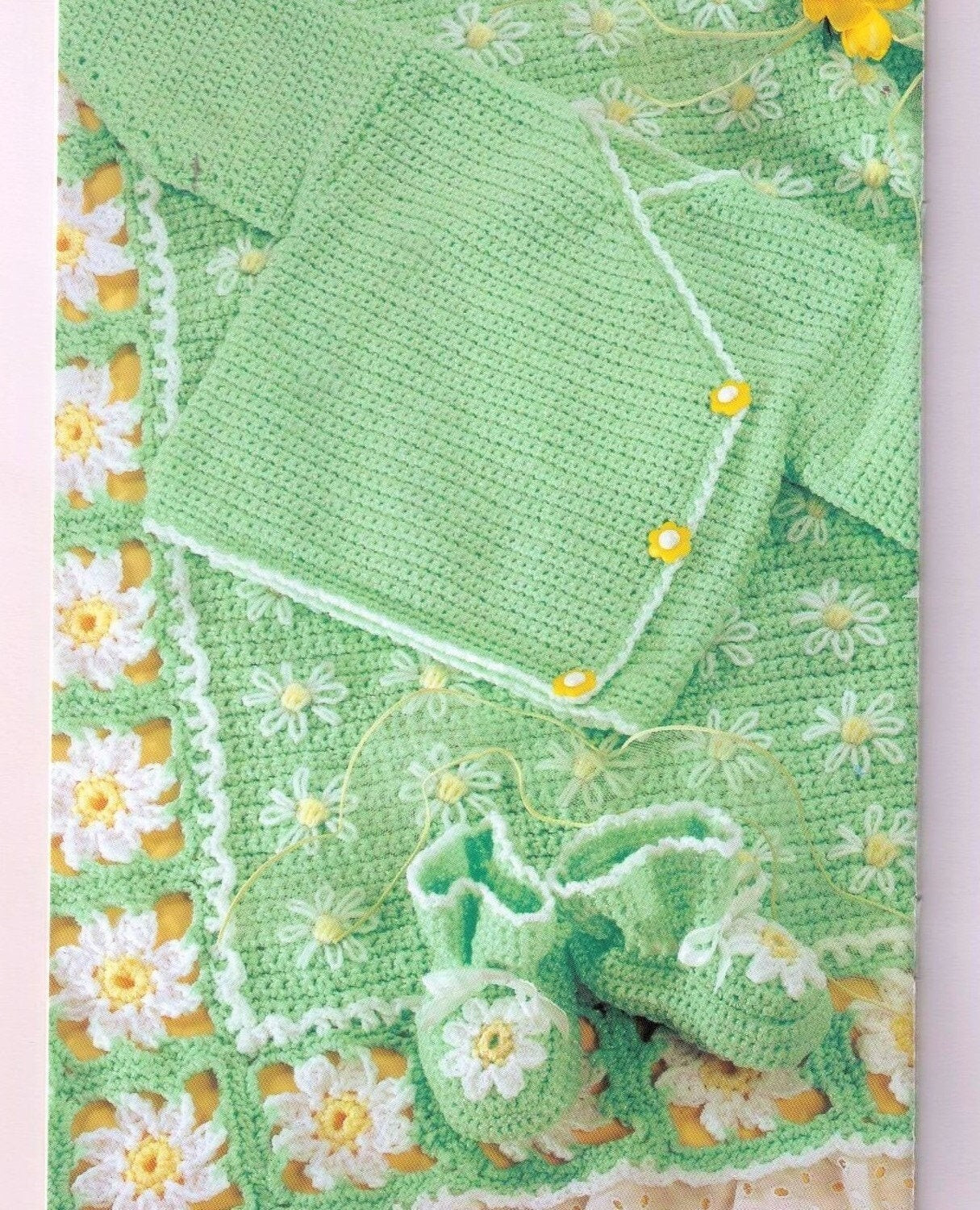 Offering a vintage PDF crochet pattern to make a sweet baby girl Daisies 4 piece set.