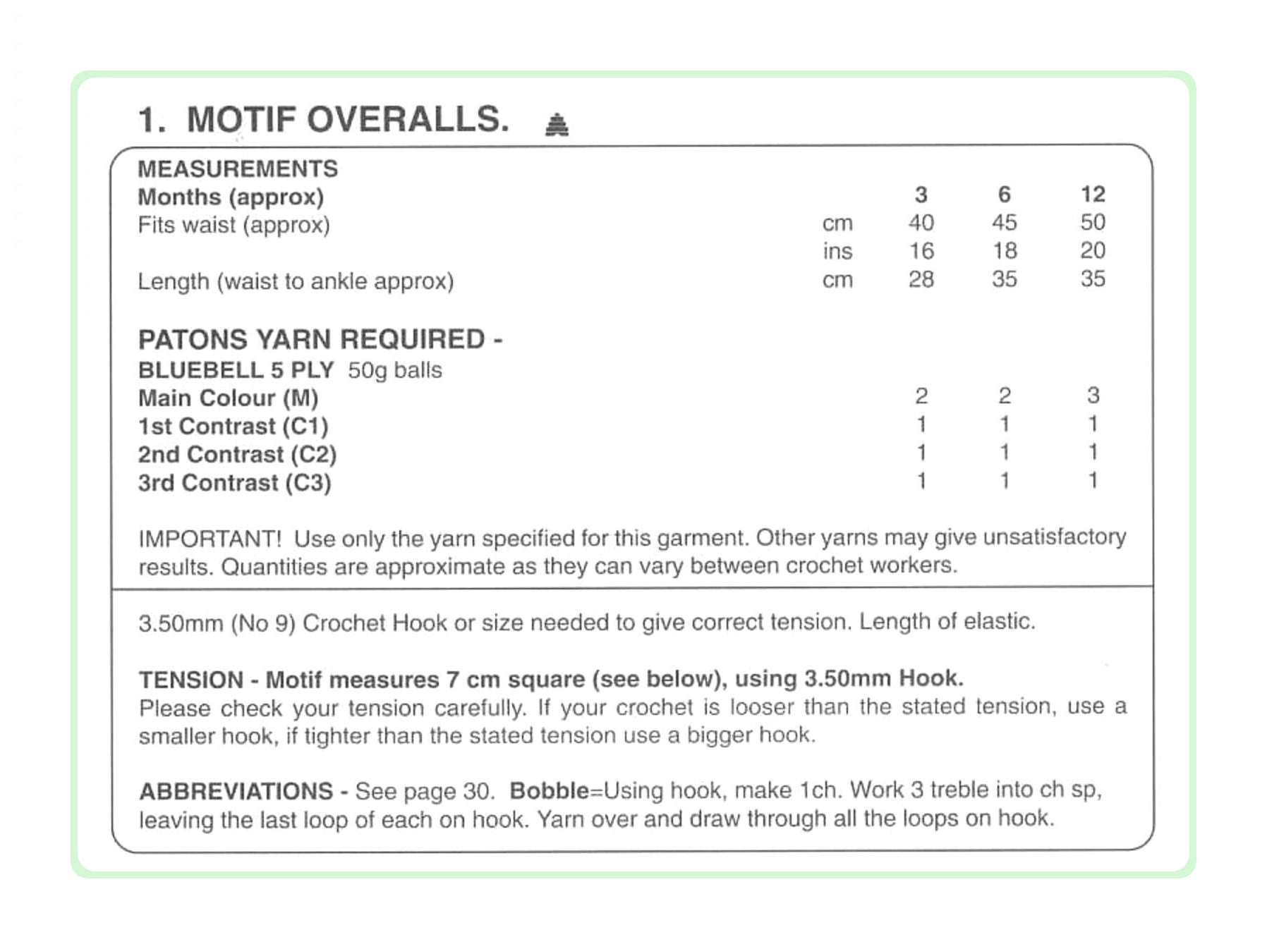 Requires 5 ply sports weight yarn, crochet hook size E/9 (3.5mm) and other materials for specific pieces (elastic for waistband, buttons, etc)