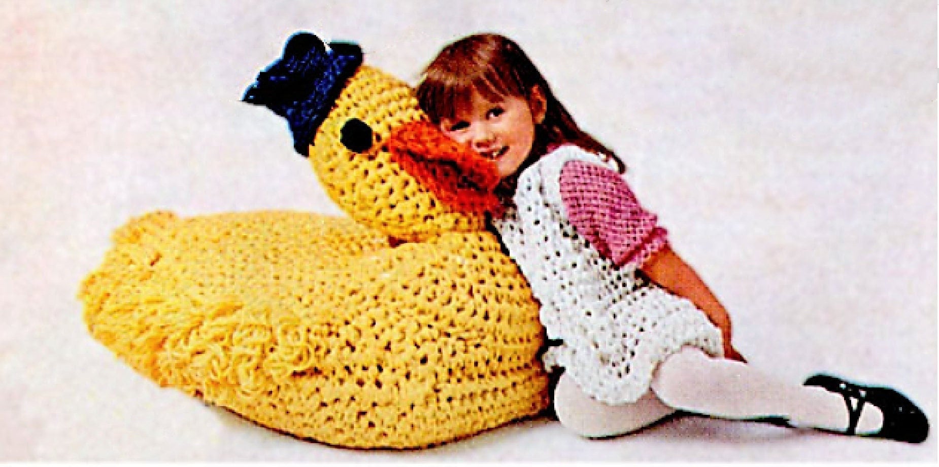 Offering a vintage digital PDF crochet pattern to make a huge, hug-able stuffed Duck ride on cushion for your toddler or young child!