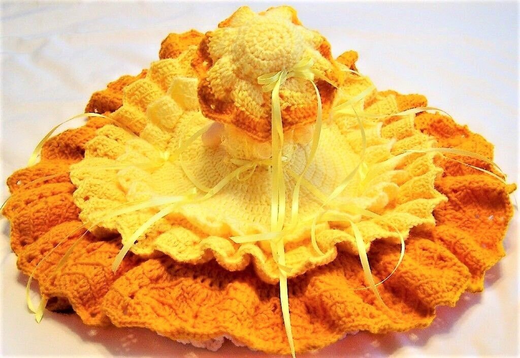 Offers complete instructions to make billowing crocheted Summery dresses and hats for 13" standing Bed Dolls or 10.5" Pillow Doll ( 8" half doll body doll which attaches to a crocheted pillow base to create a firmly stuffed skirt - instructions for pillow form are included).