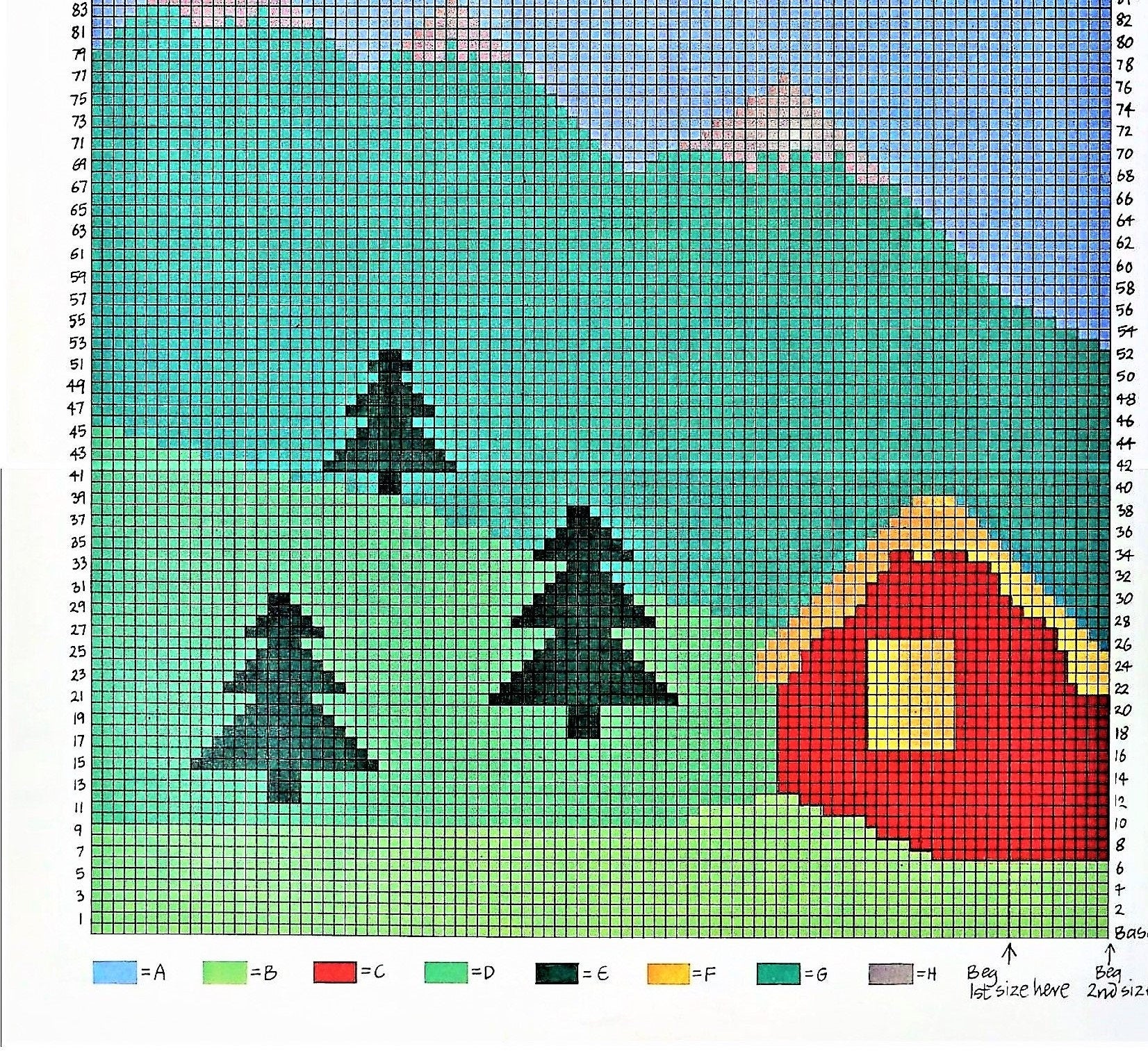 Easy row by row instructions and full color charts for the worked in design (with color keys) is included. Embroidery details to finish (ie: French knot snowflakes).