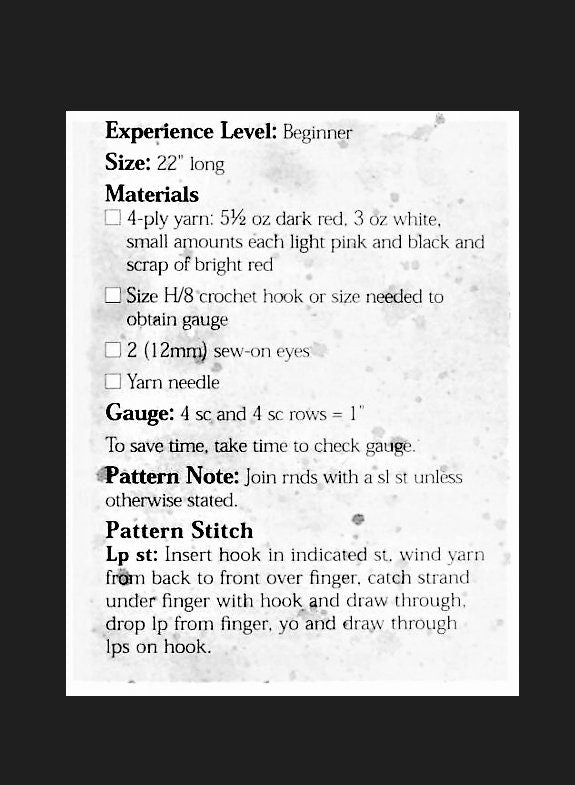 Requires 4 ply worsted yarn, hook size US H/8 hook and other materials listed in 2nd photo.