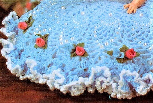 Offering a vintage instant PDF crochet pattern to make a pretty, billowing Pineapple Dress and matching hat with ribbons and pearls embellishments, for a pillow bed doll.