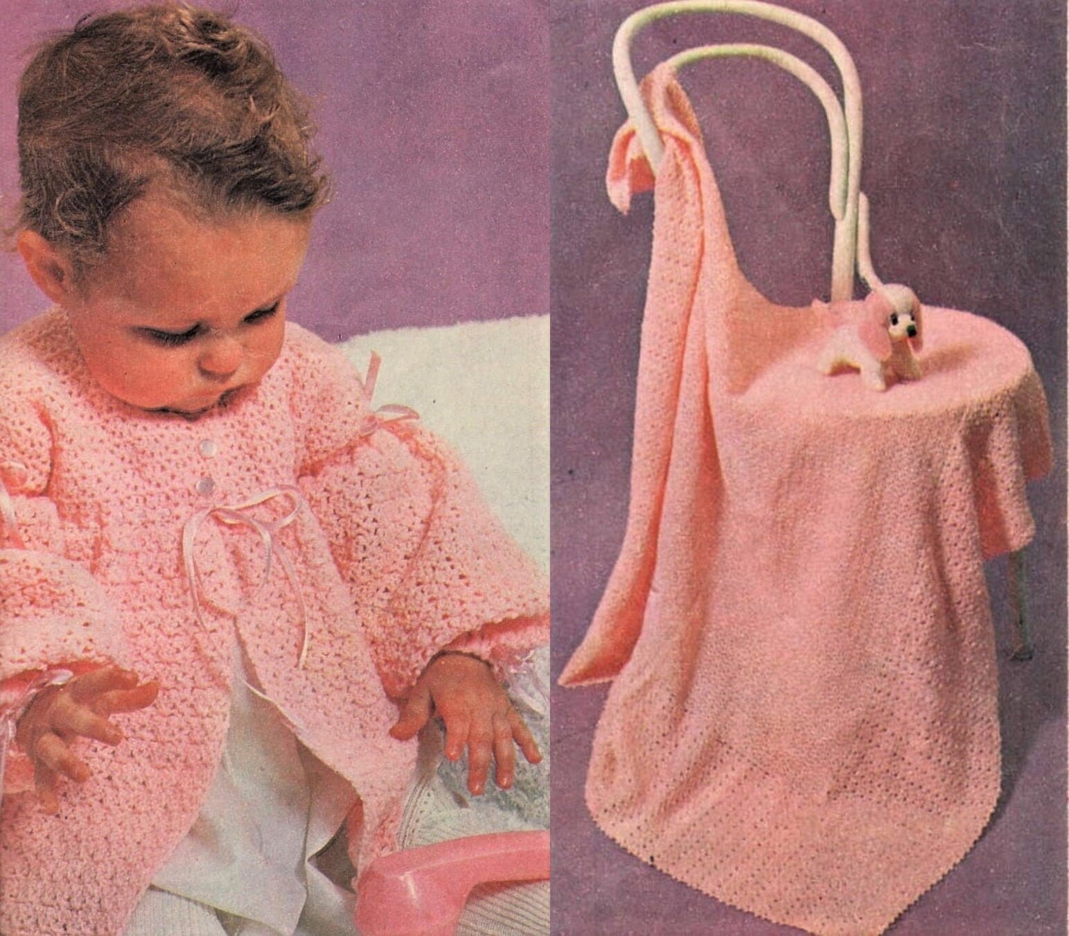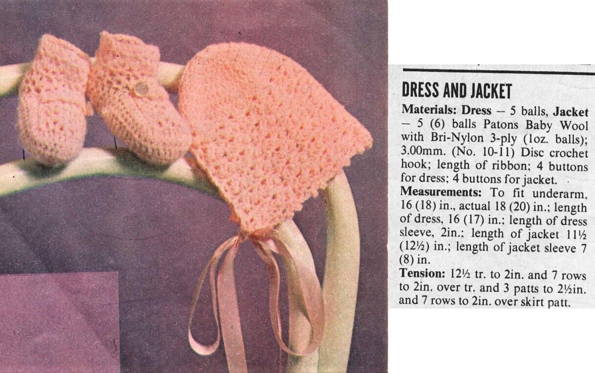 Offering a vintage digital PDF crochet pattern to make a beautiful, retro 5-piece layette set for a baby girl.