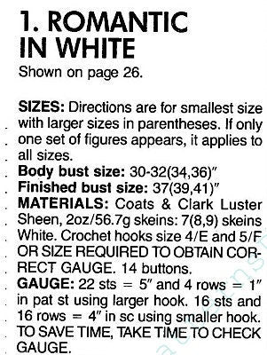 Requires sports weight 5-ply yarn, 4/E and 5/F hooks and 14 buttons for back.