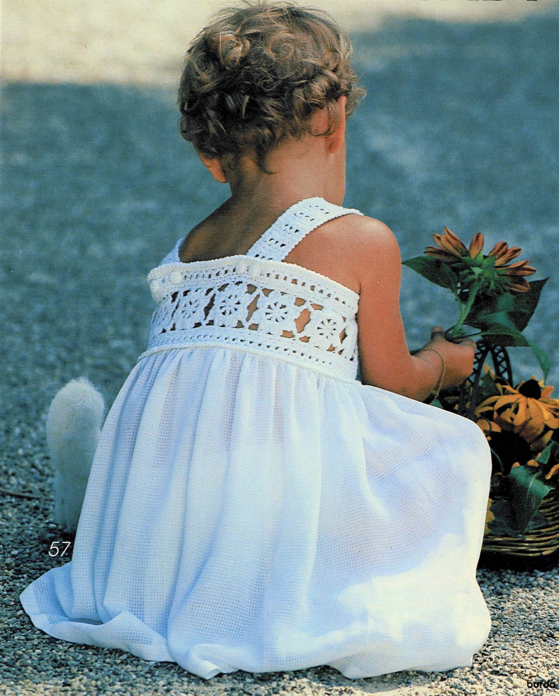 Offering a vintage PDF crochet pattern to make a pretty, summery white dress with floral crochet top for toddler girl!