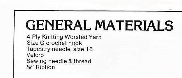 10-ply worsted yarn, size G hook, size 16 tapestry needle, velcro, sewing needle & thread and ribbon.
