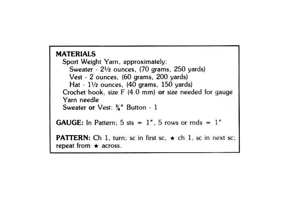 Requires 5-ply sports weight yarn hook size F/4.00mm and small button for each sweater or vest.
