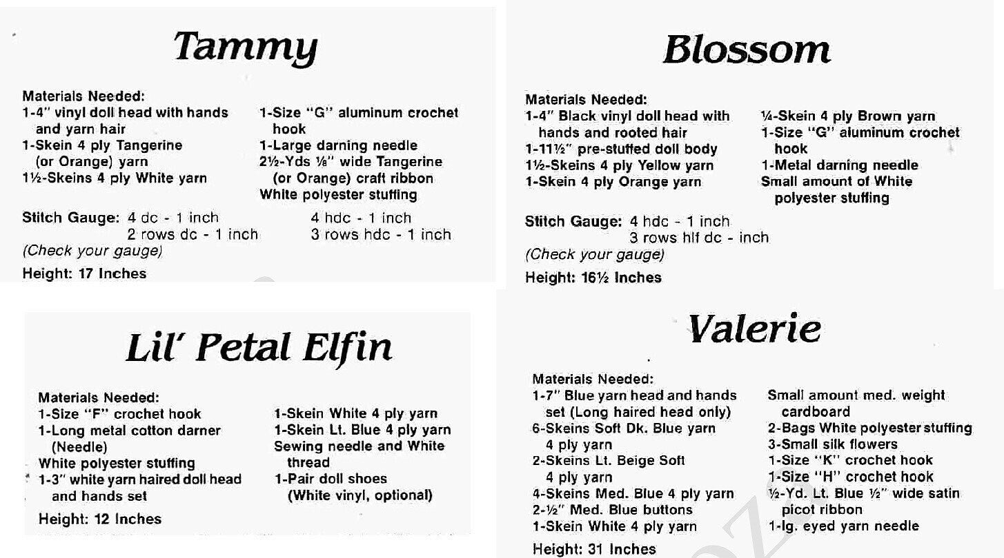 Requires 4 ply yarn, yarn head doll head and hands sets ( in sizes 3 in, 4 in and 7 in) and other materials listed in 6th photo.