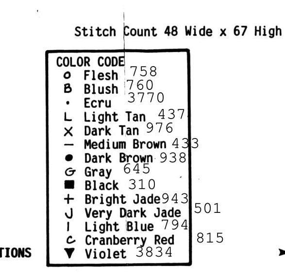 Pattern includes step by step written instructions, Santa template diagram with floss color key, and illustrated stitch chart for stitches used ( cross stitch, back stitch, straight stitch and french knot). DMC floss numbers have been added beside color key chart.