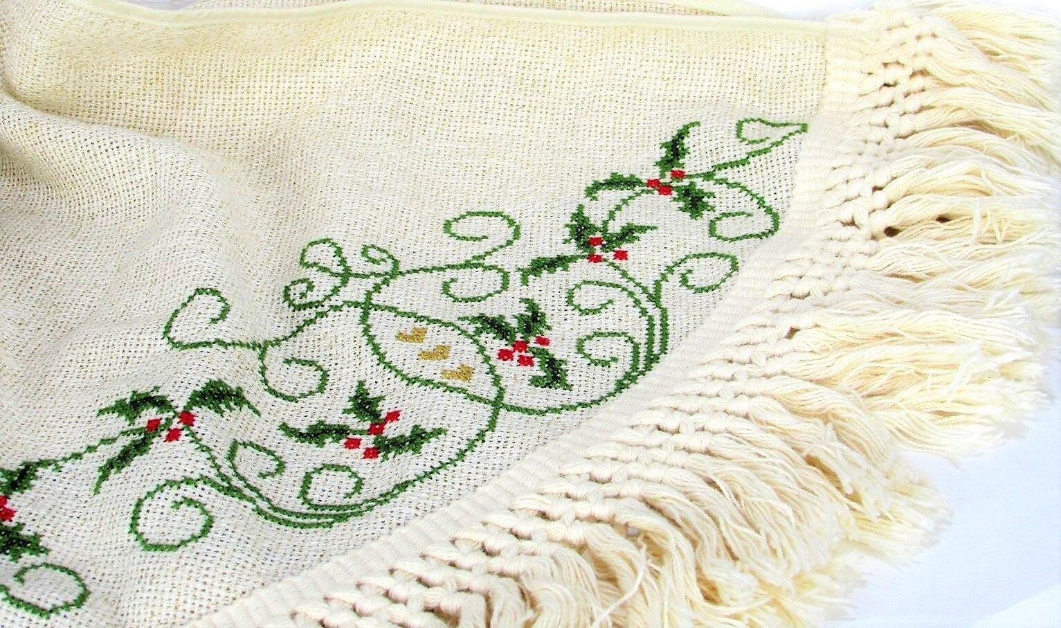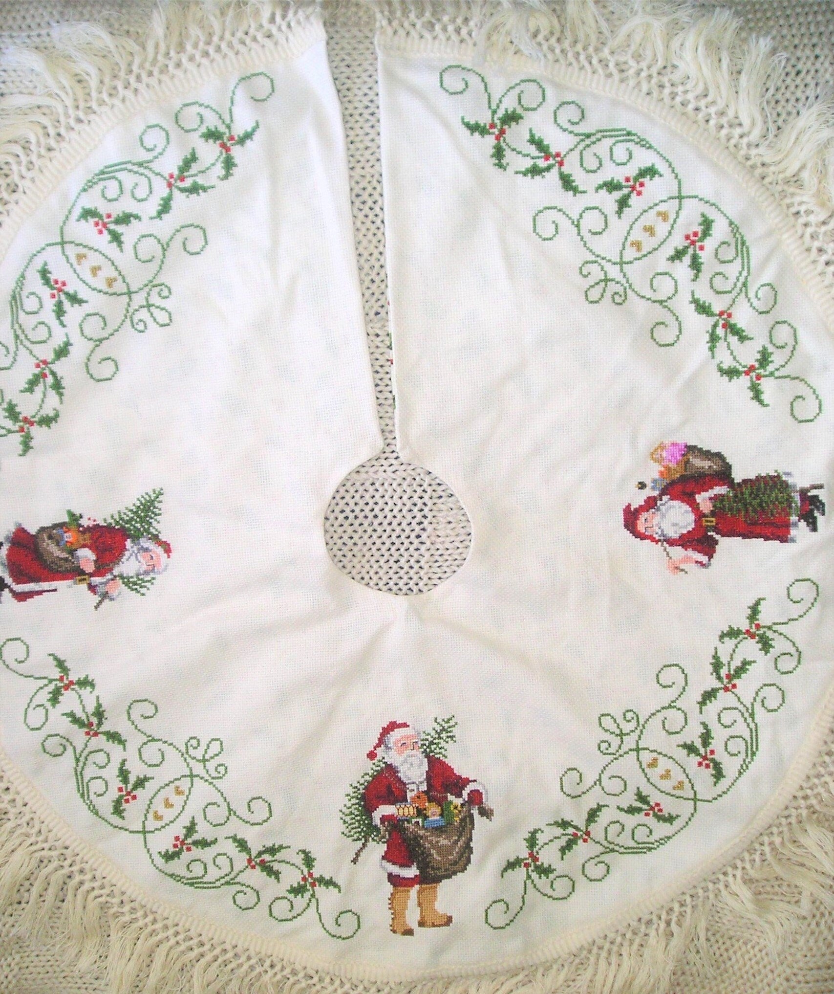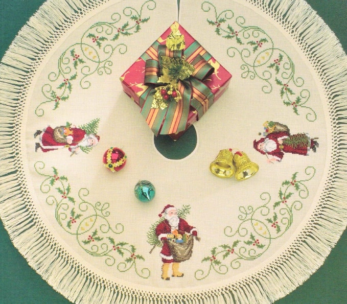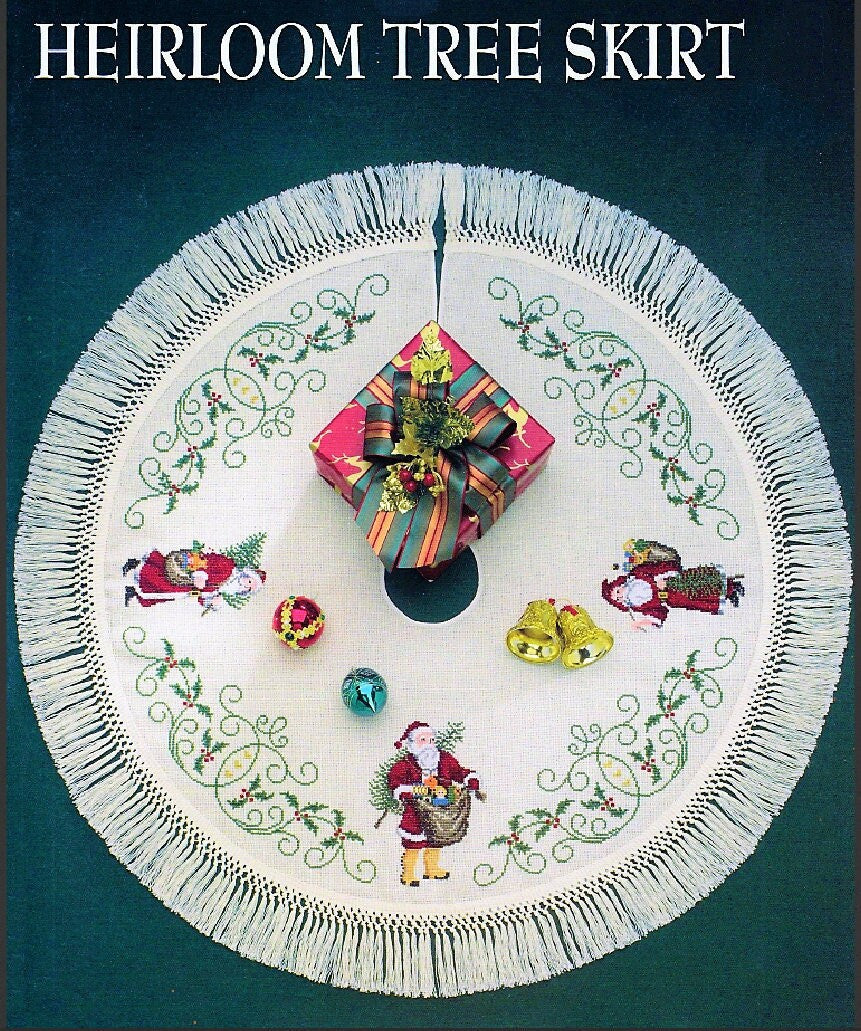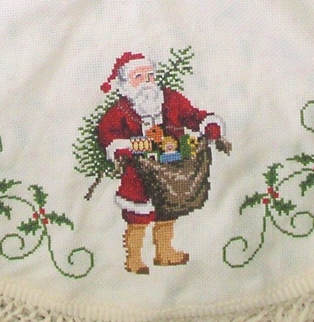 Offering a vintage digital PDF cross stitch pattern to make a beautiful Heirloom Santa with holly scrolls designed tree skirt!