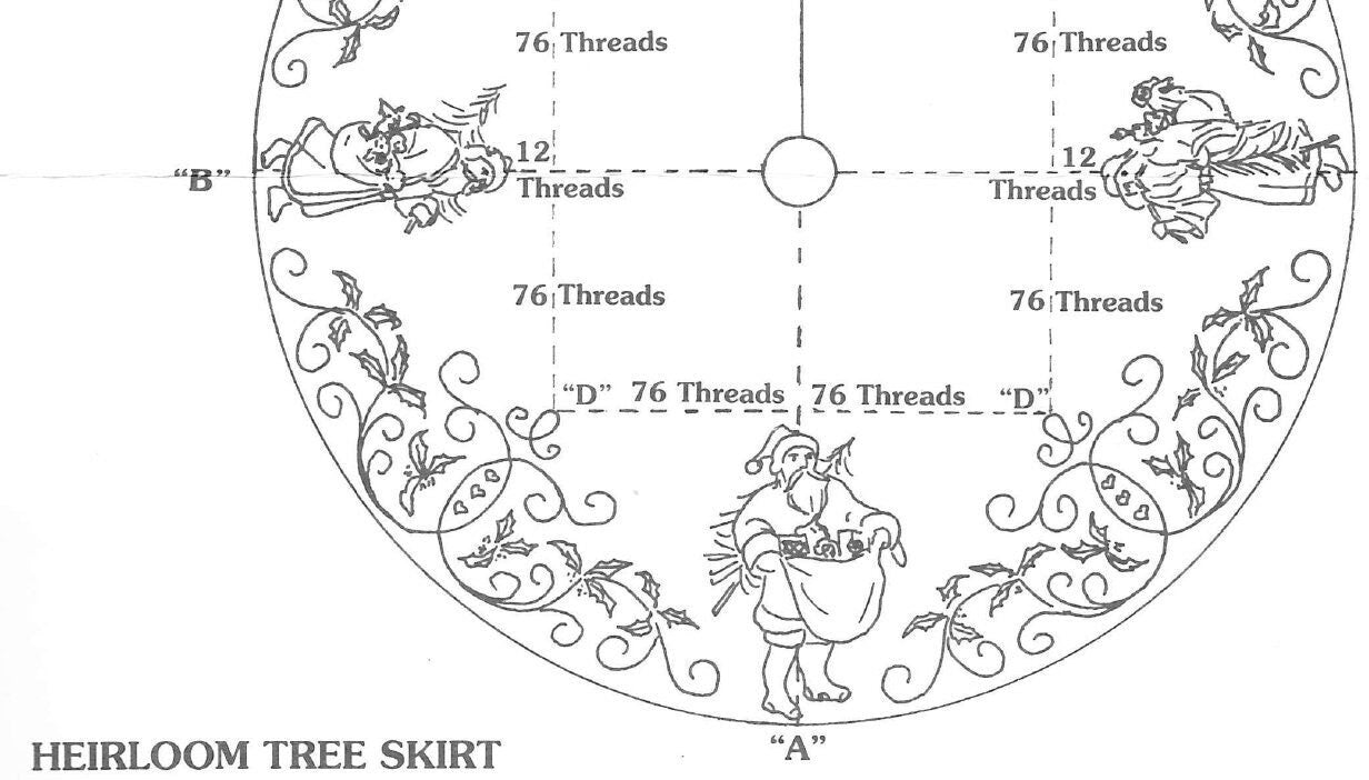 Also includes instructions to make your own tree skirt from 10 ct fabric by pinning a 35" paper pattern to fabric, cutting and machine sewing.