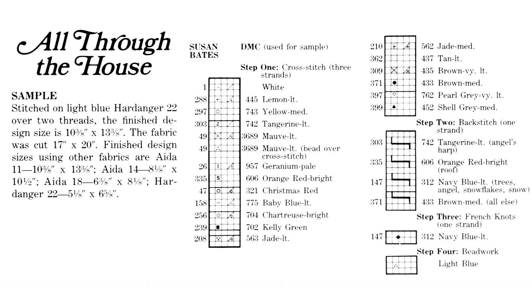Stitched on a light blue 22 Hardanger/Aida cloth over 2 threads, the finished design will be approx 10.5" x 13.5". Instructions for other smaller finished sizes using different Aida is also included.