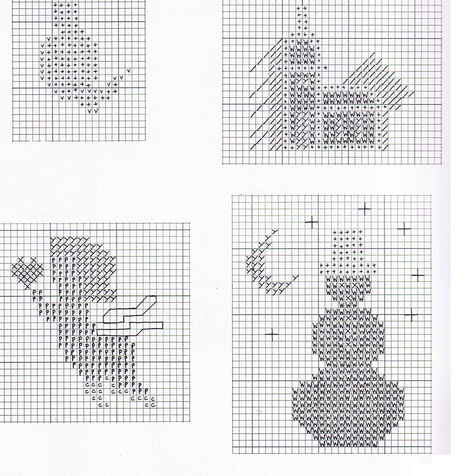 Requires 14 count Aida cloth, small frames with hooks (plastic or mini grapevine wreaths), and embroidery thread.