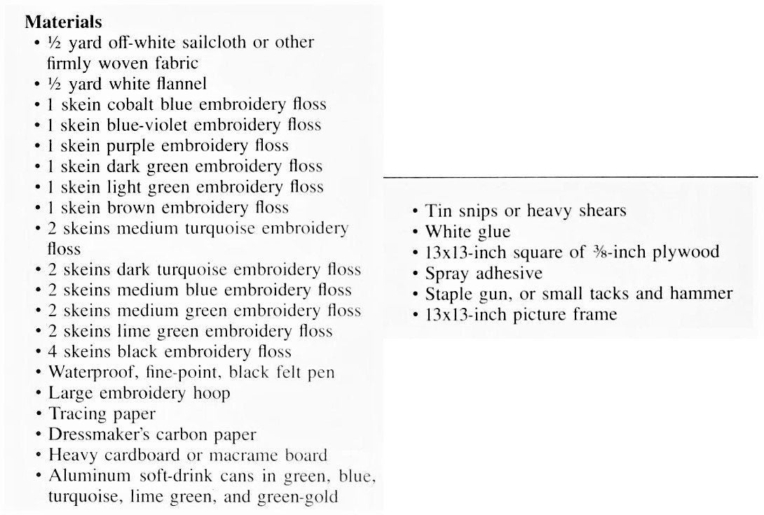 Instructions for enlarging, transfering design to fabric and embroidery stitch chart are included.