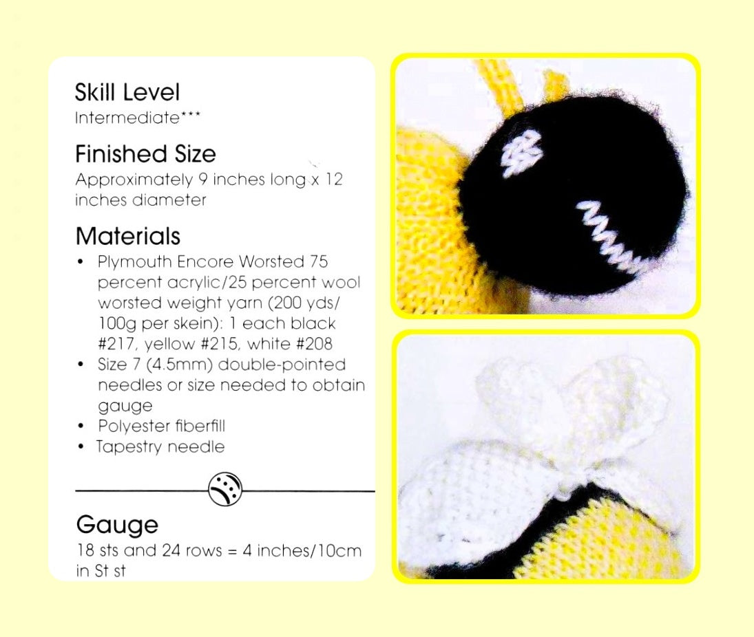 Offering a vintage digital PDF knitting pattern to make an adorable stuffed baby bumblebee!