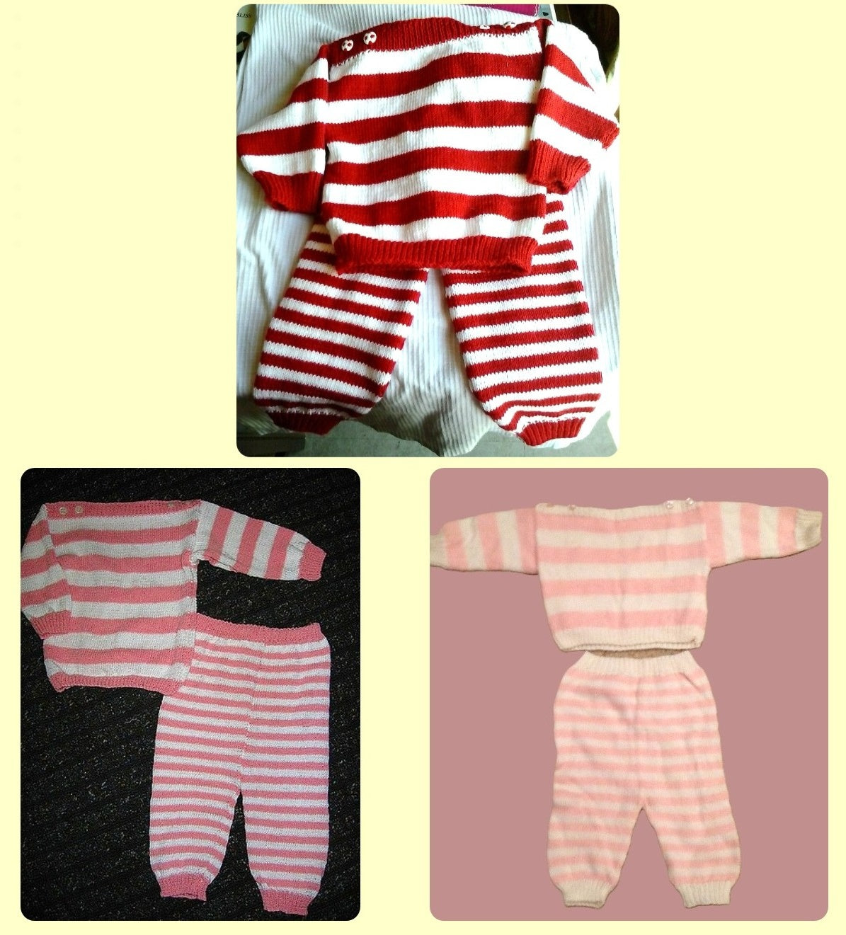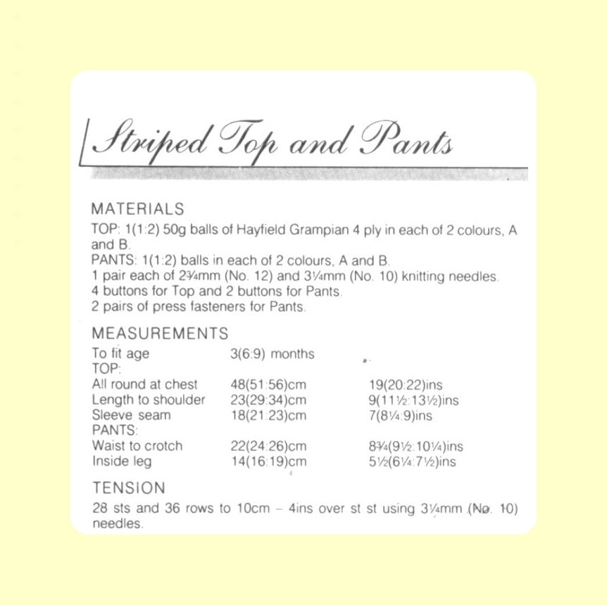 Offering a vintage PDF knitting pattern to make a sweet striped sweater top and pants for a baby boy or girl!
