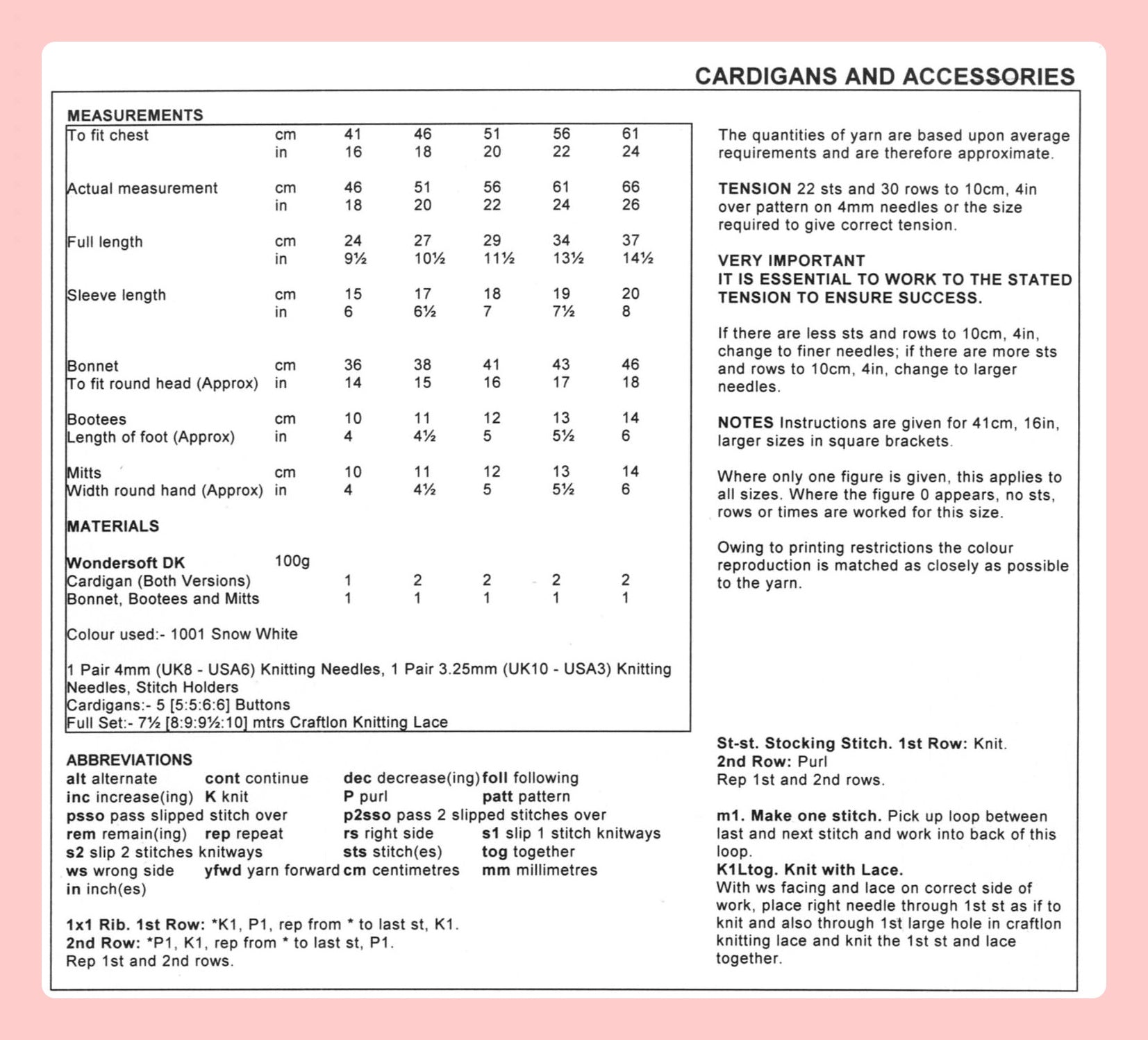 Pattern includes instructions for : 2 different cardigan sweaters, booties, bonnet and mitts - too cute!!