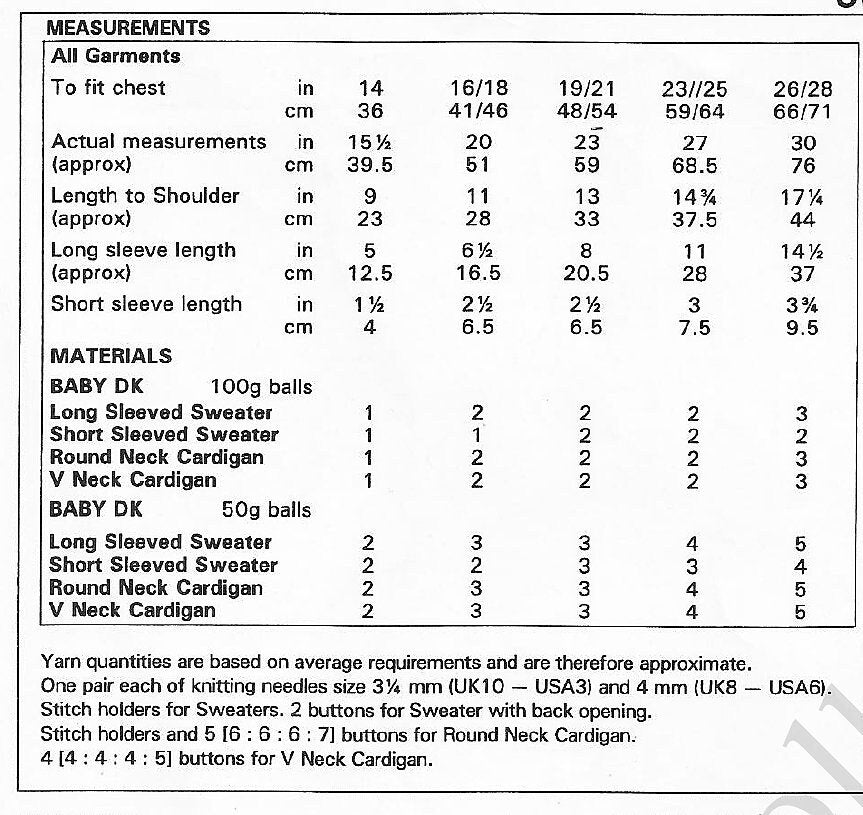 Also requires pairs of 3.25mm (UK10/US3) and 4mm (UK8/US6) knitting needles, stitch holders and buttons.