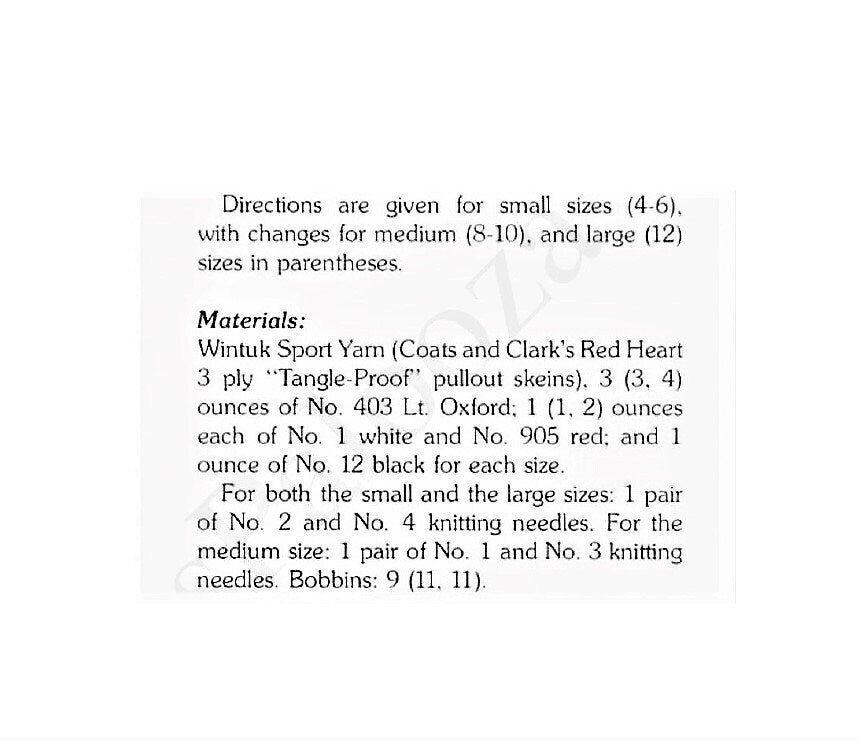Requires 5 ply sports weight yarn, and pairs of no. 2 and 4 needles ( for small and large) and pairs of no. 1 and 3 needles for medium, and bobbins.