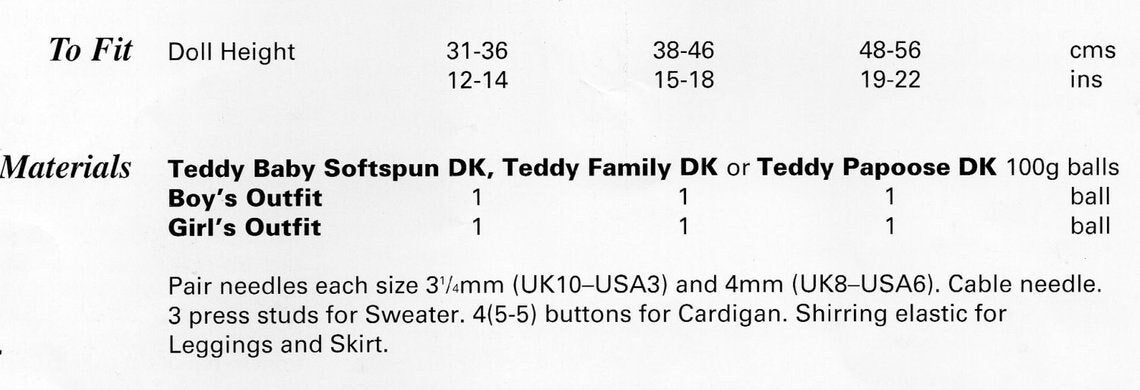 Offering a vintage PDF knitting pattern to make adorable outfits for three doll sizes : 12-14, 15-18 and 19-22 inches (31-36, 38-46, 48-56cm)