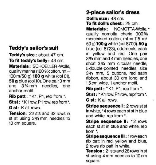 Offering a vintage PDF knitting pattern to make adorable nautical themed outfits for 18 to 19 inch dolls and bears!