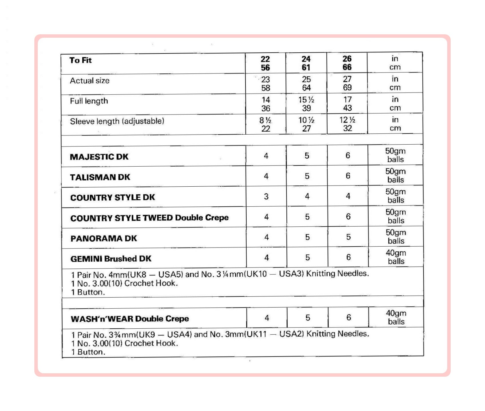 Requires DK 8 ply yarn, pairs of UK8/US5 (4mm) and UK10/US3 (3.25mm) needles, no 10/3mm crochet hook for collar edge and 1 button.