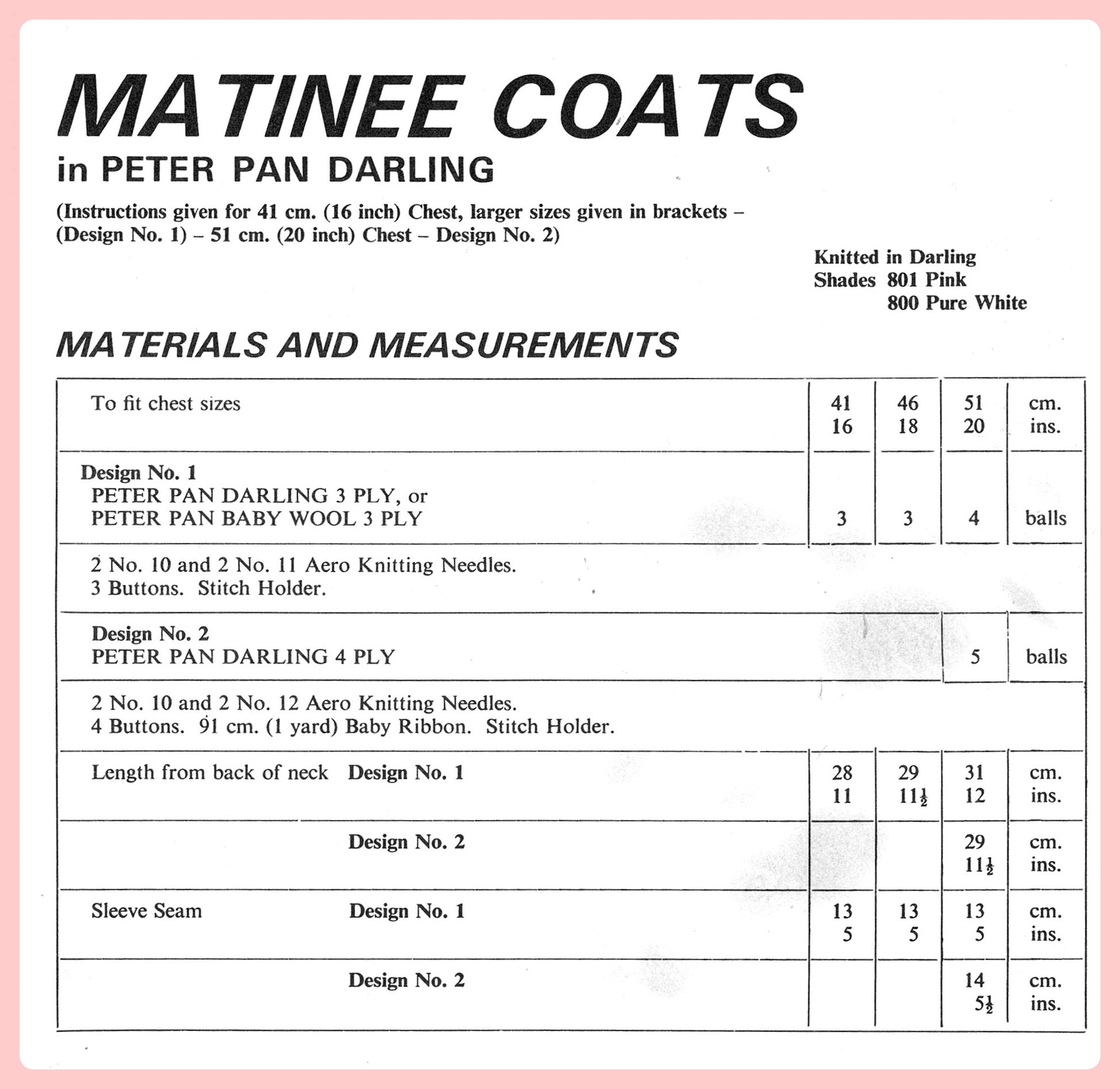 Also requires pairs of knitting needles sizes UK10/US3 3.25mm, UK11/US2 3.00mm and UK12/US1 2.75mm, stitch holders, buttons and baby ribbon.