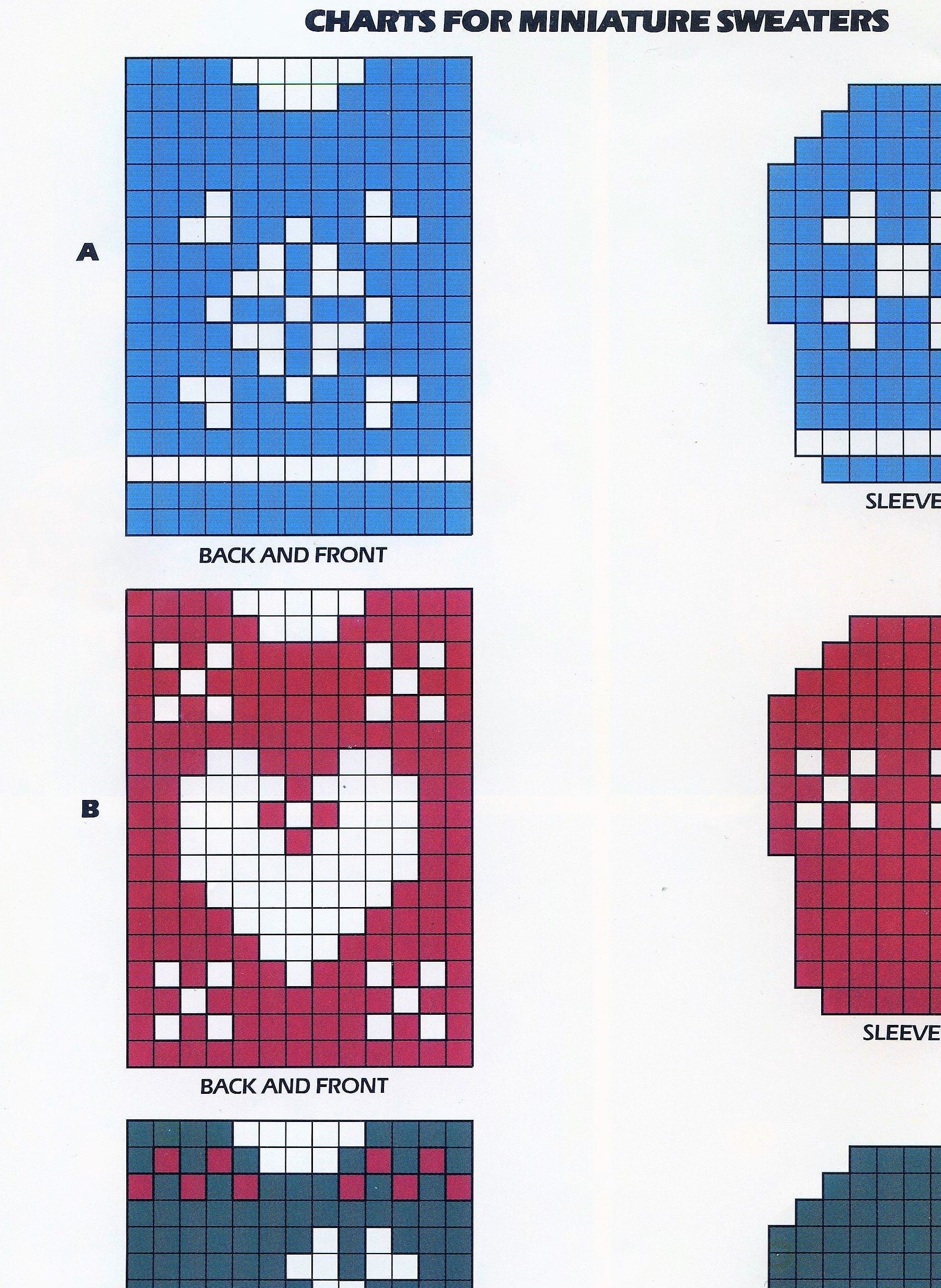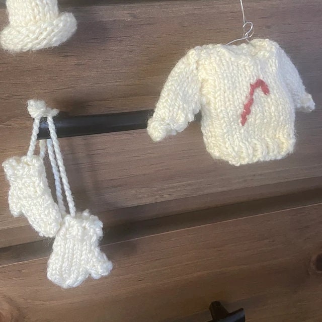 Offering a vintage digital PDF knitting pattern to make decorative and adorable knitted miniature sweater, mitten and hat ornament sets!