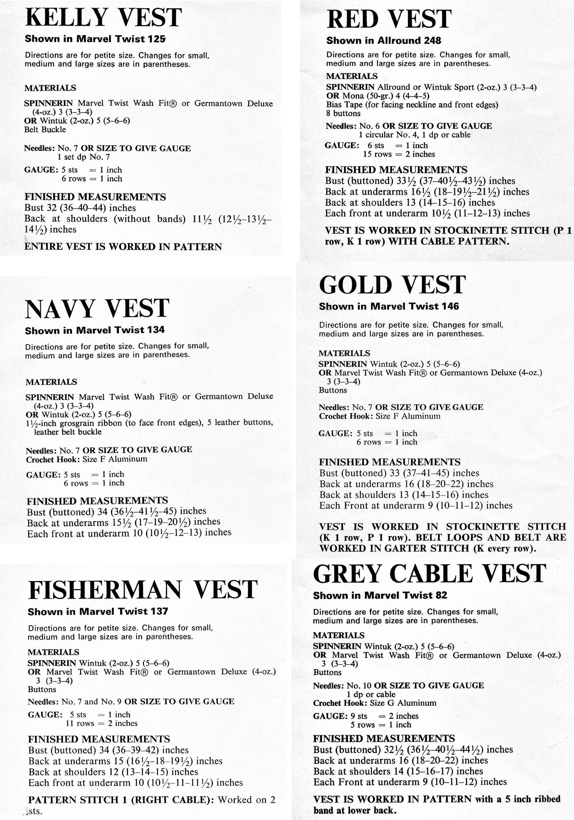 Belted Kelly Vest, Double Breasted Red Vest, Buttoned Navy Vest (with belt), Buttoned Gold Vest (with low belt), Fisherman Vest and Grey Cable Vest.
